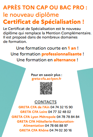 Vous trouverez l’ensemble des certificats de spécialisation présents en Auvergne-Rhône-Alpes sur le site de la region ent.auvergnerhonealpes.fr