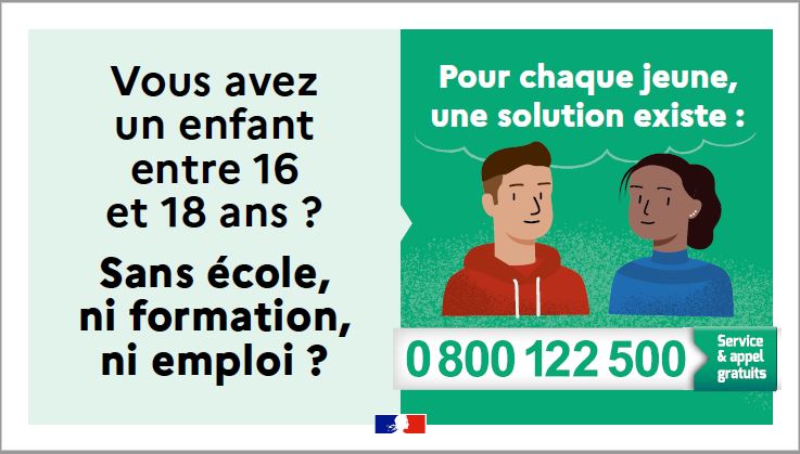 Pour aider ceux qui en sont privés à bénéficier de solutions de formation entre 16 et 18 ans, le Gouvernement a mis en place un numéro vert le 0 800 122 500 avec des conseillers des services des ministères de l’Éducation nationale et du Travail. Ce numéro est ouvert à tous les jeunes et leurs familles. N’hésitez pas à le faire connaître aux personnes de votre entourage qui pourraient être en recherche de solution de formation !